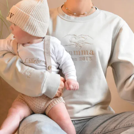Kosekluter med navn, personlige barneklær, smekker med tekst og barnegensere med brodering – perfekte som unike og minneverdige gaver til baby og barn.