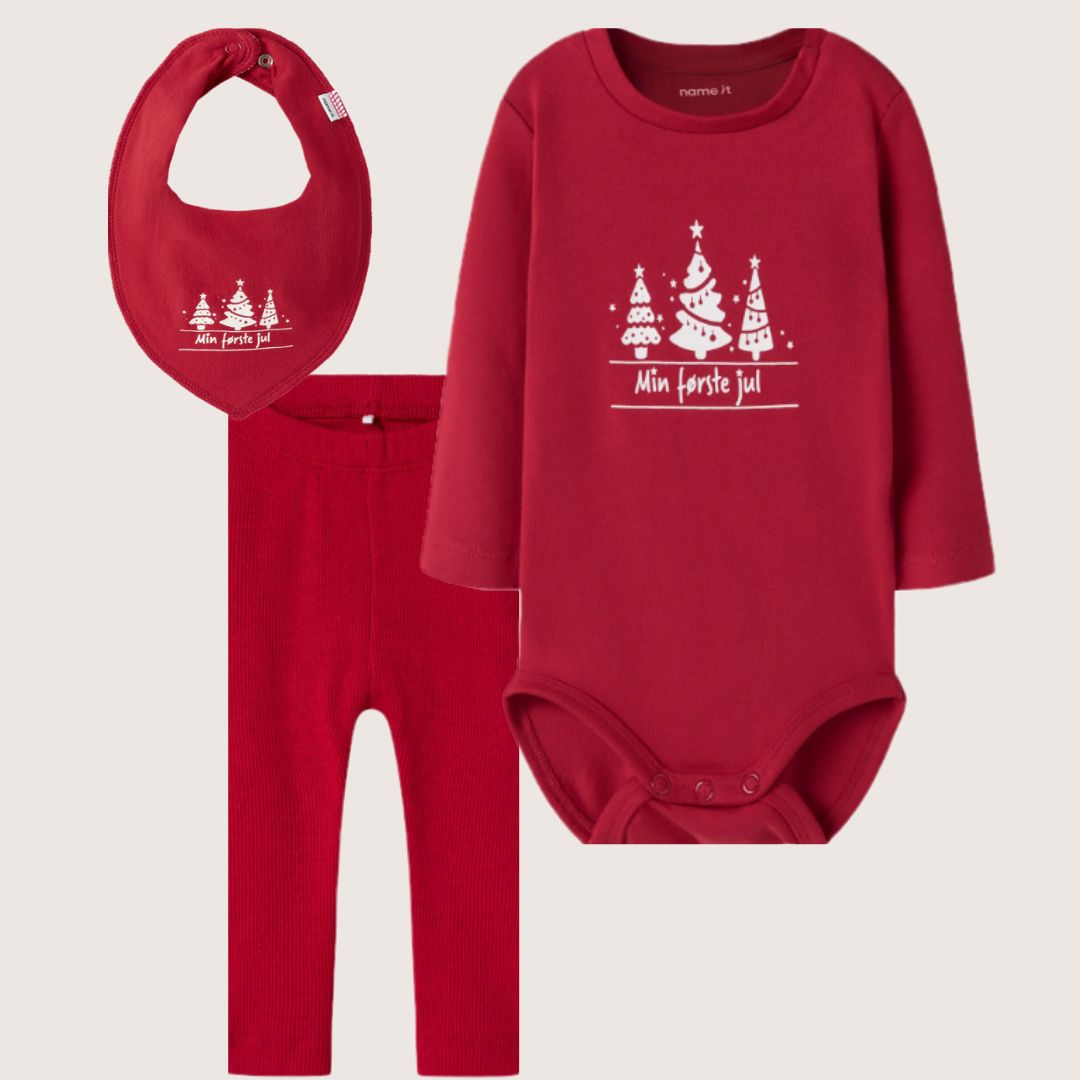 Feir julen i festlige og komfortable plagg som sprer glede og julestemning. Dette 3-delte julesettet for baby fra Nameit består av body, leggings og smekke med nydelig juleprint. Perfekt til babyens aller første jul.