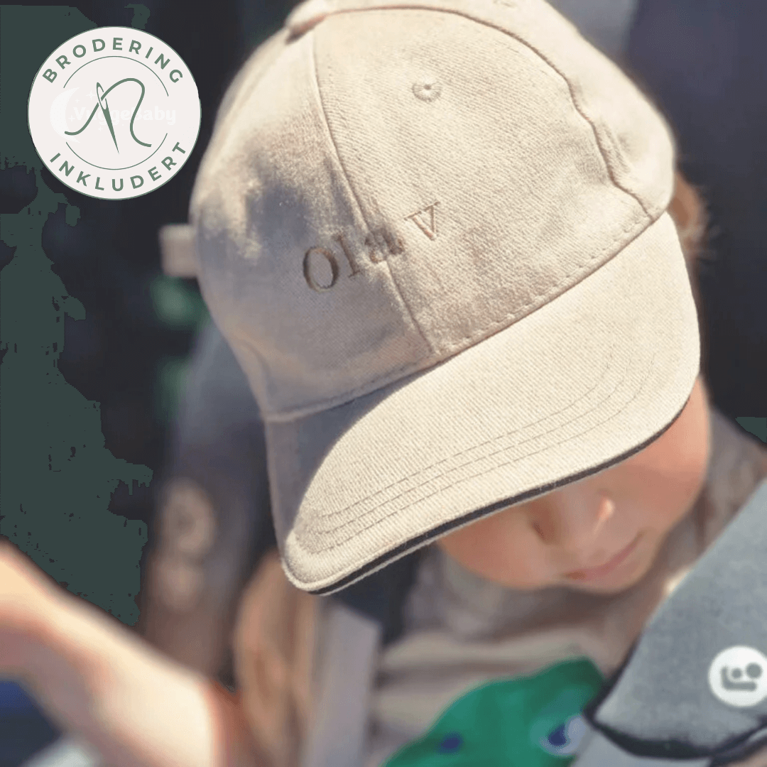 Barnecaps med navn, laget av 100% bomull. Tilpass med personlig brodering. Pustende, justerbar stropp og UV-beskyttende design fra norsk lager.