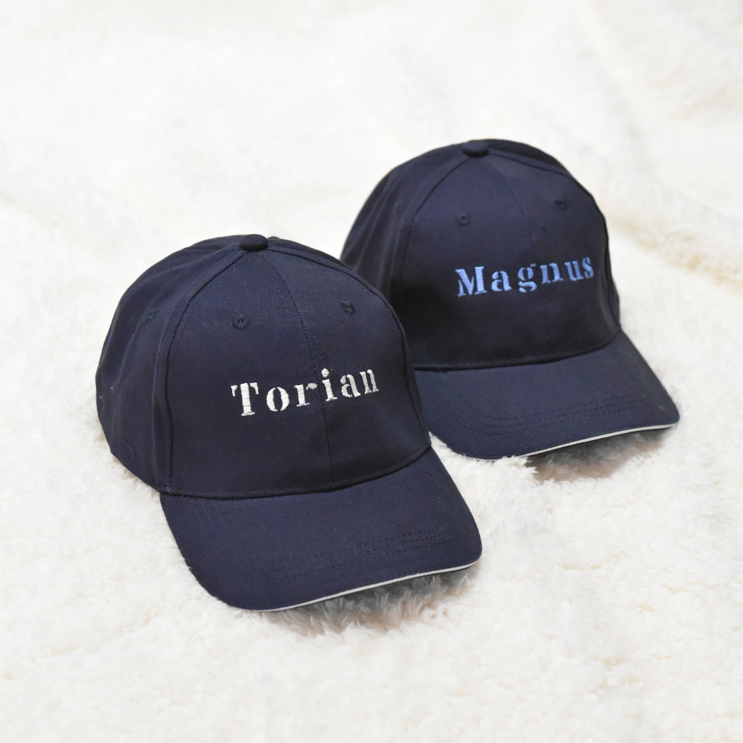 Barnecaps med navn – gjør antrekket ekstra stilig og personlig med vår stilrene caps for barn med navn! Capsen er laget i myk og pustende bomull, passer godt for aktive sommerdager ute. Caps med seks paneler og med tynn kontraststripe på bremmen som gir et ekstra stilig preg.