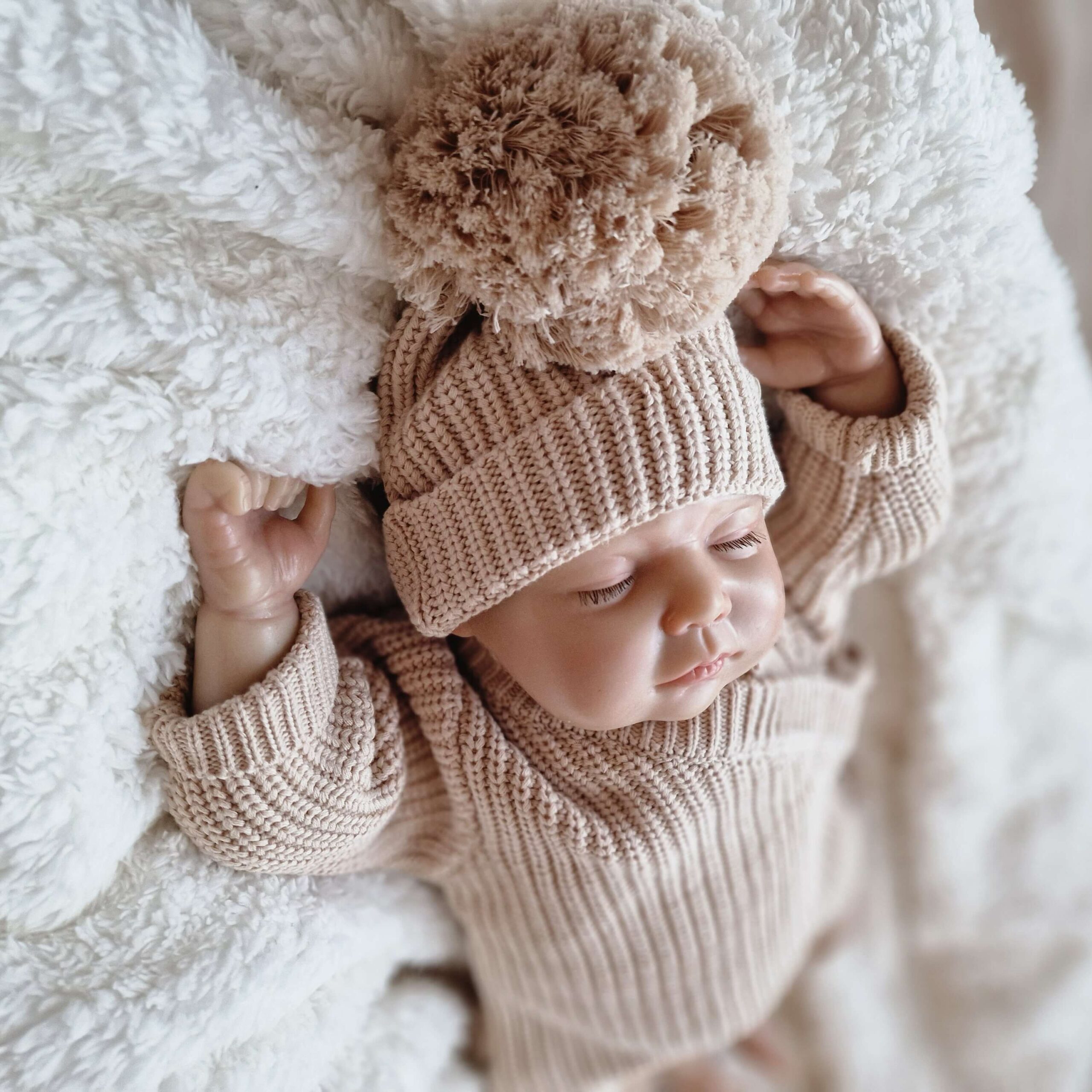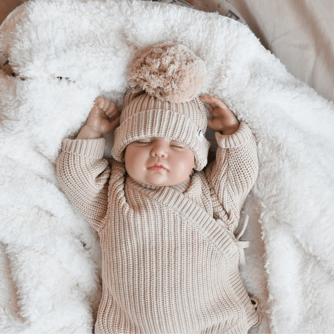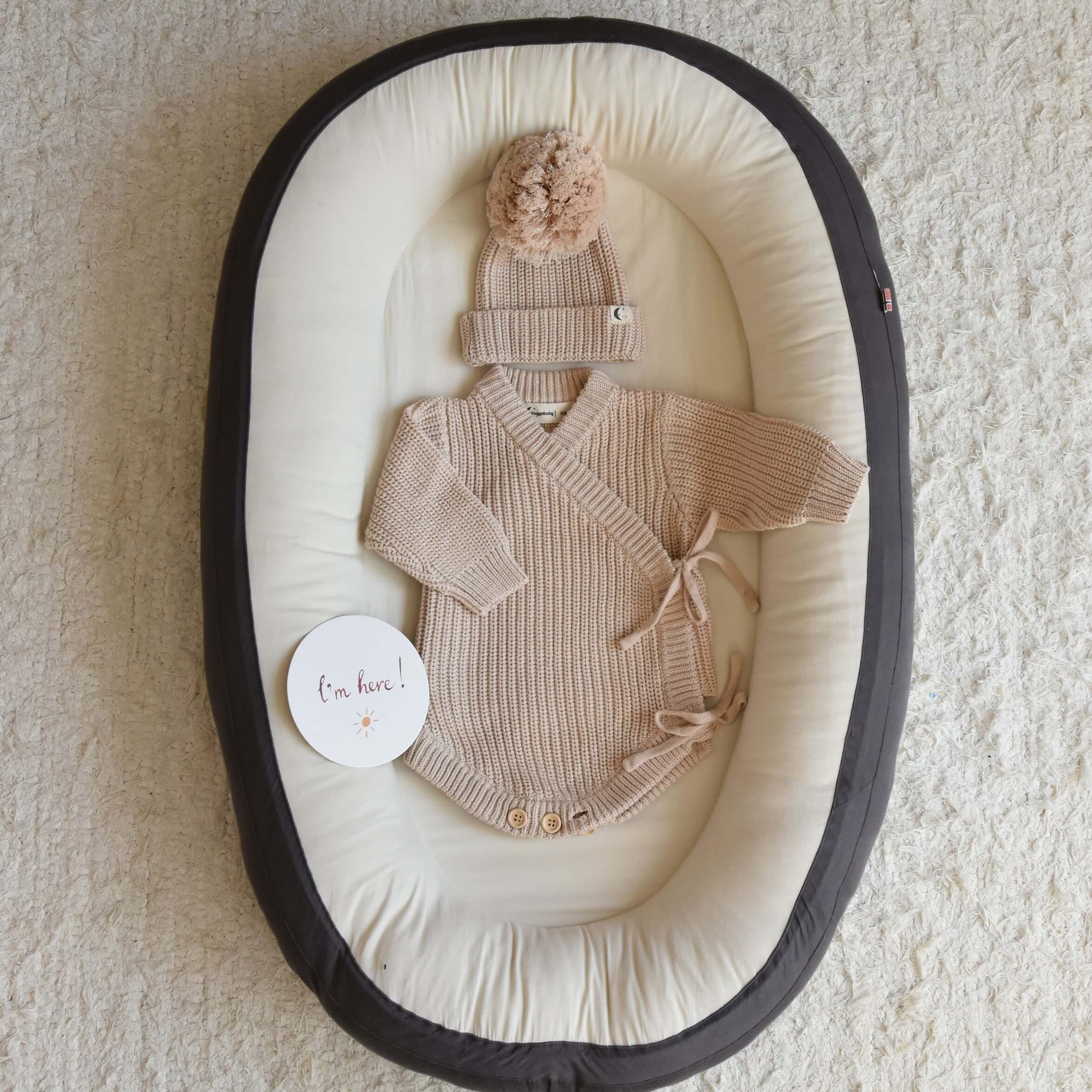 En kjærlig og elegant gave til den nyfødte. Dette elegante settet inneholder en myk strikkelue og en praktisk omslagsbody i varm vanilla-farge, helt unisex og perfekt for både gutter og jenter. Alt er laget av myk, pustende 100% bomull som er skånsom og allergivennlig mot babyens sensitive hud.
