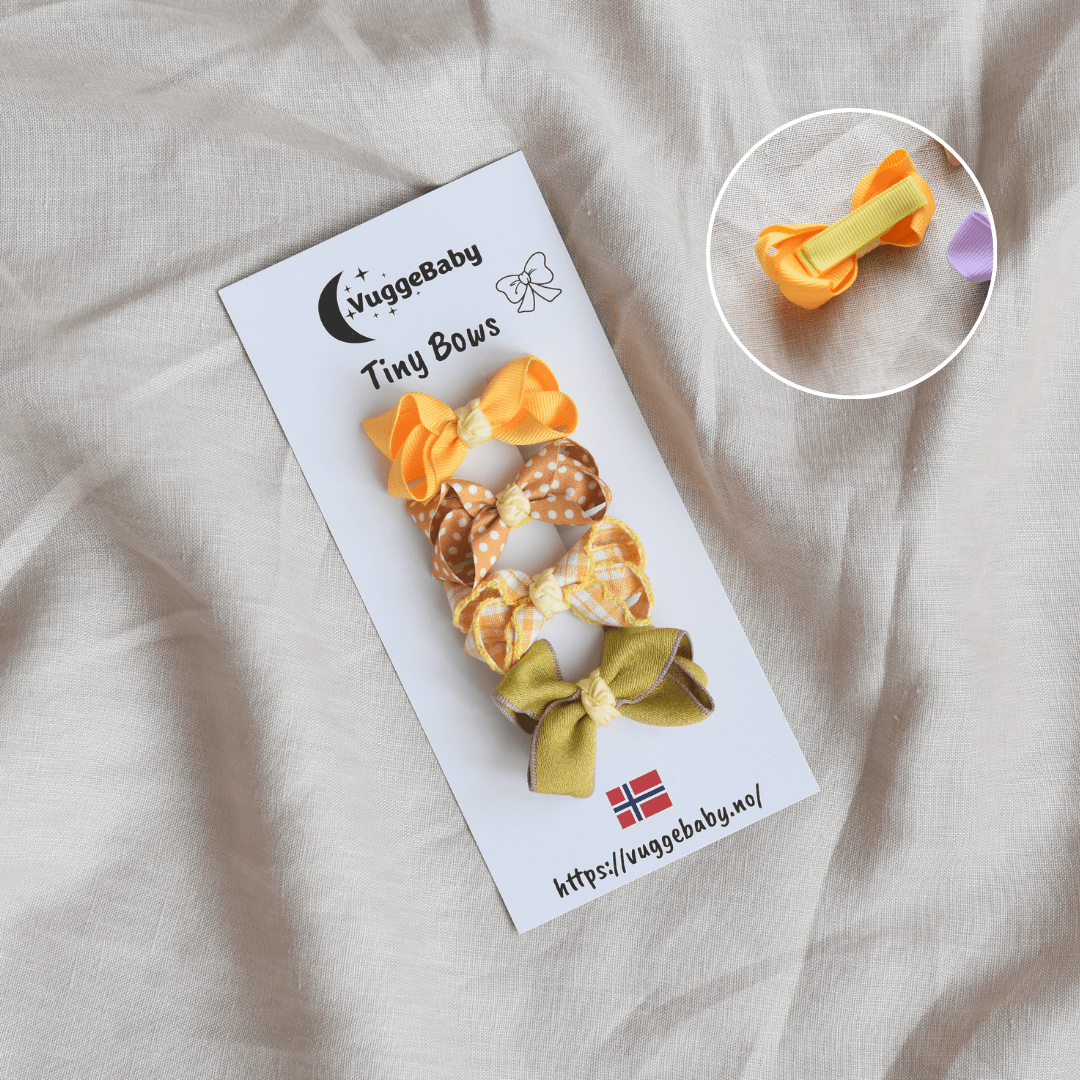 Tiny Bows er vår egen serie hårpynt. Hver pakke inneholder fire sløyfer i harmoniske farger som gjør det enkelt å variere antrekk. Sløyfene er laget i fine, nøye utvalgte stoffer som gir et levende og naturlig uttrykk. Hver sløyfe har sin egen lille karakter.