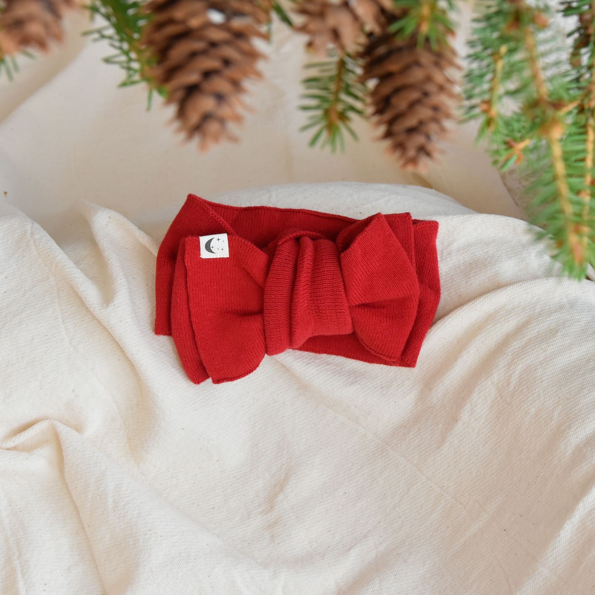 Et mykt og oversized hodebånd med sløyfe, strikket i bomull for å sitte behagelig på små hoder.