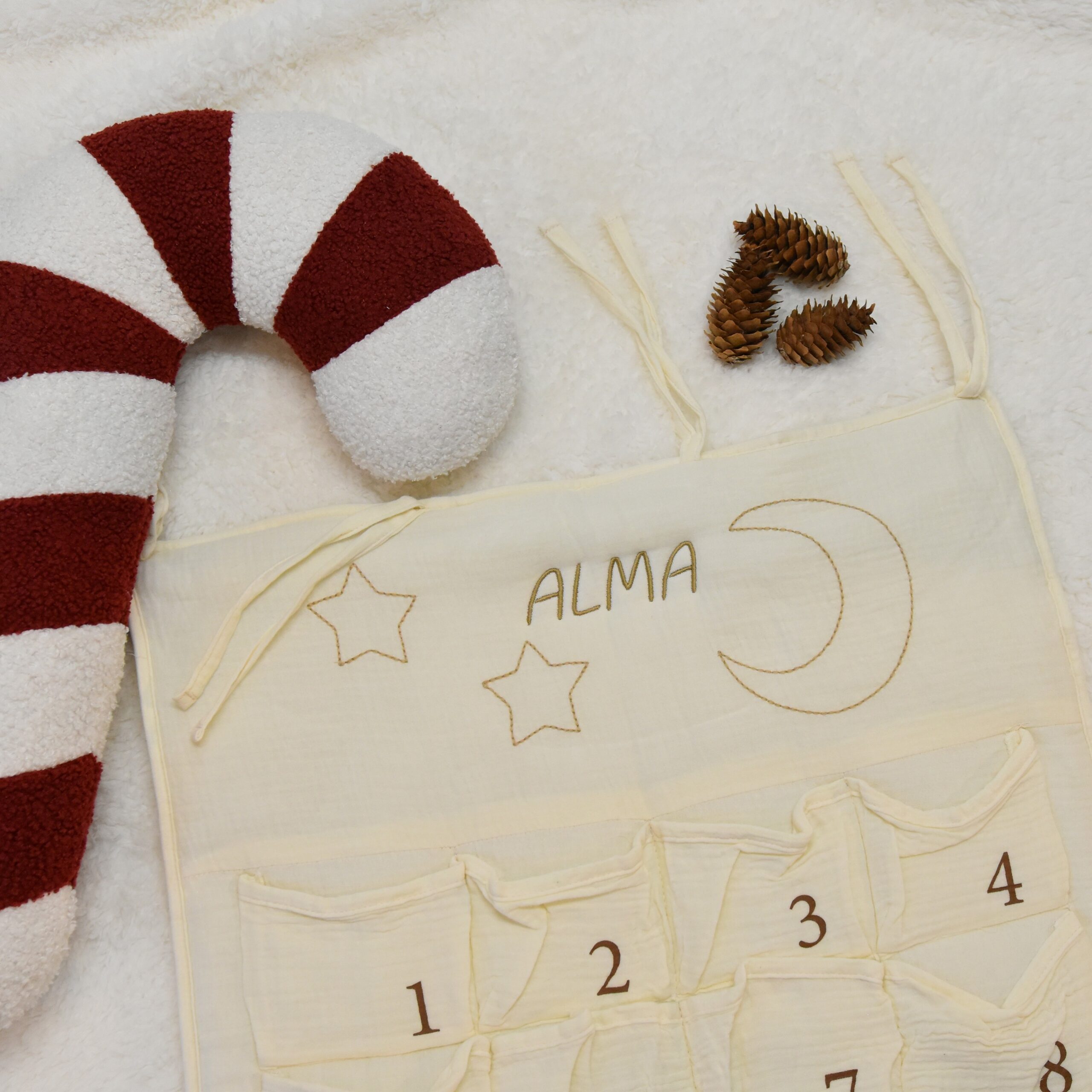 Nydelig julekalender fra LilAtelier laget av 100% økologisk bomull som kommer til å brukes sesong etter sesong. Den har praktiske lommer til små julegaver. Broder barnets navn på kalenderen og skap kjærlige minner som varer. Med robuste materialer og glatte overflater tilbyr den sikkerhet og holdbarthet. Kalenderens ergonomiske utforming gjør den lett tilgjengelig for barn, og de små skuffene gir god plass til å gjemme små overraskelser.