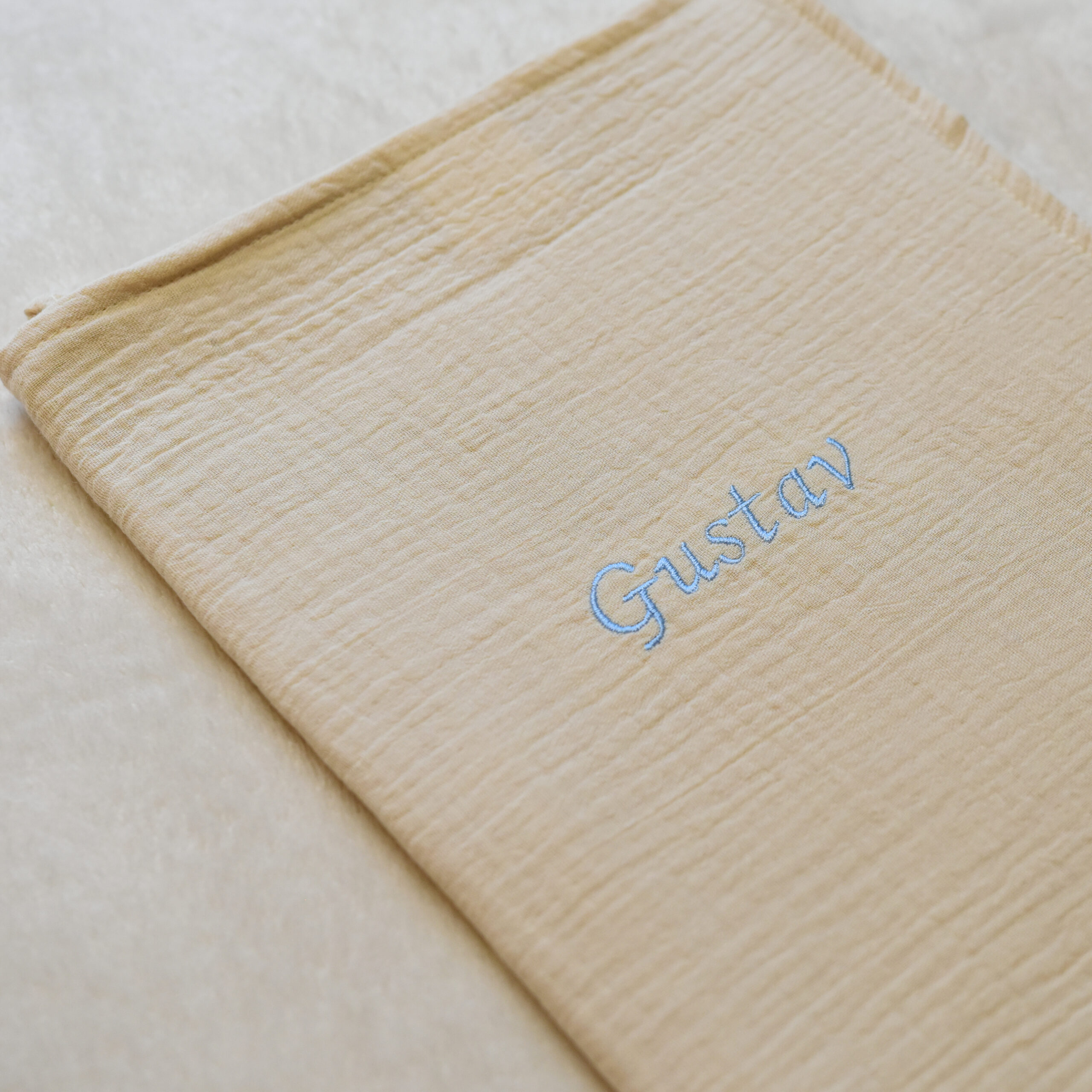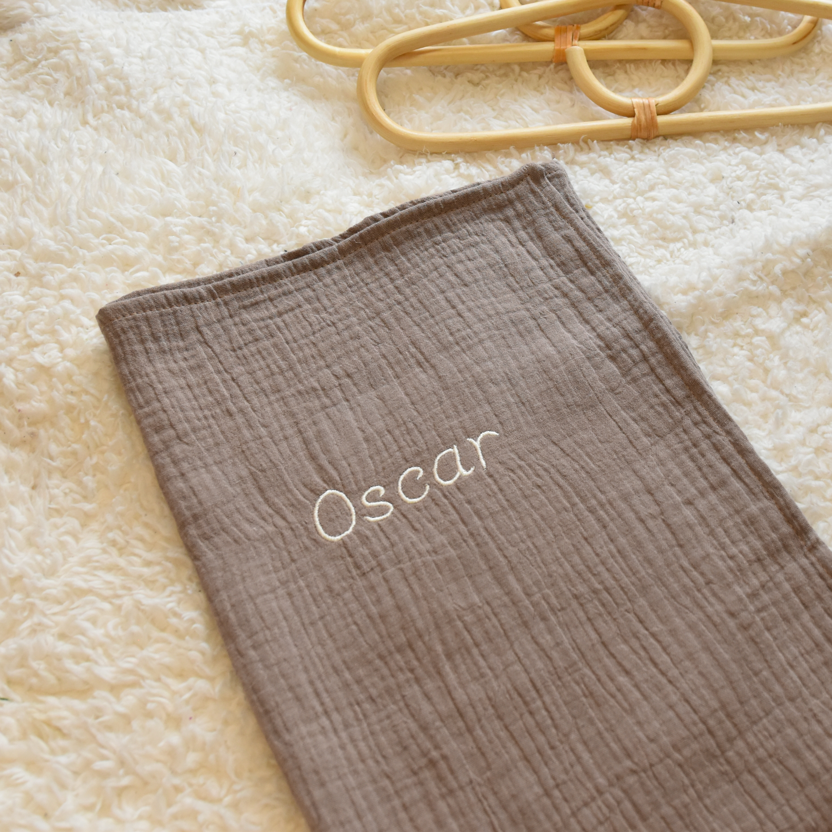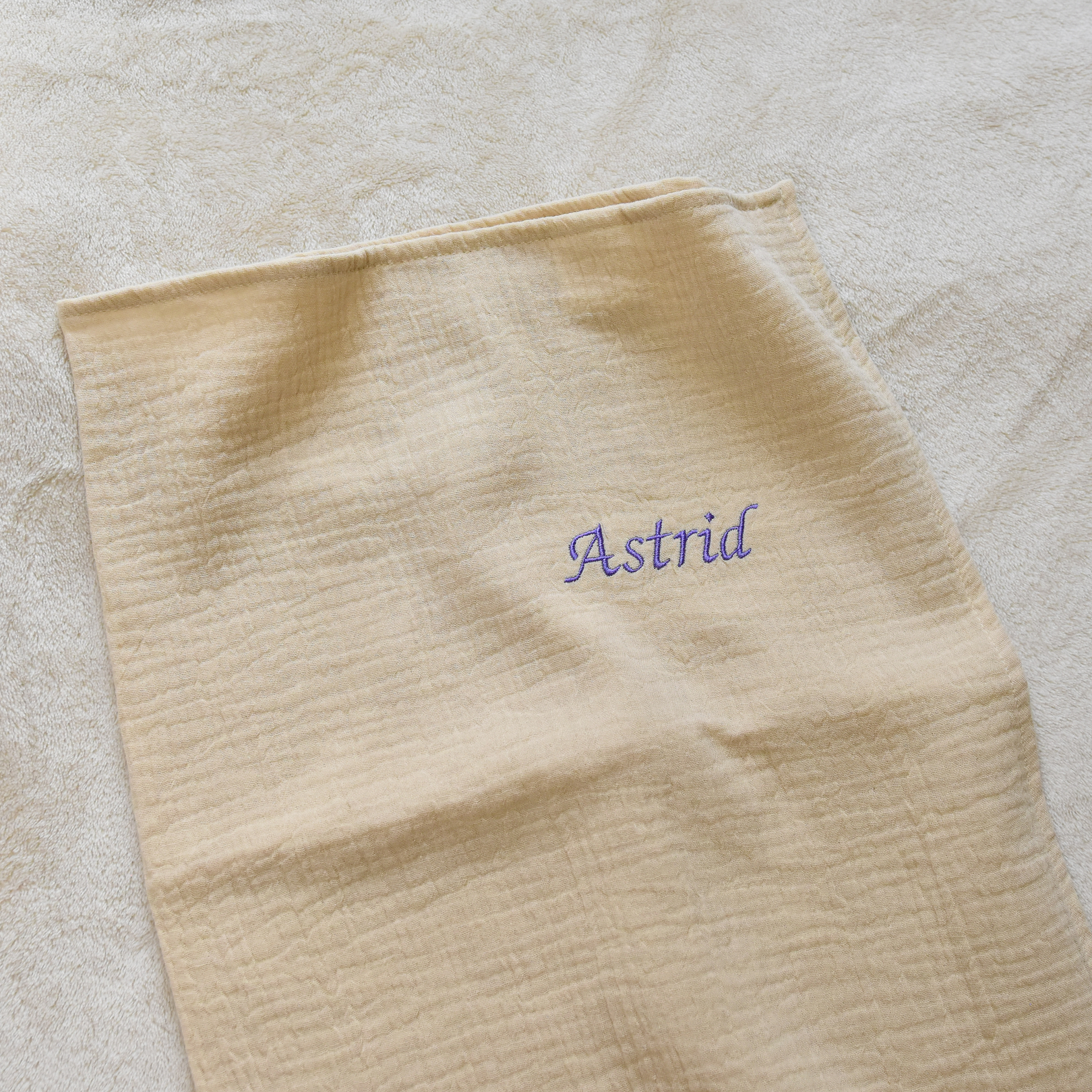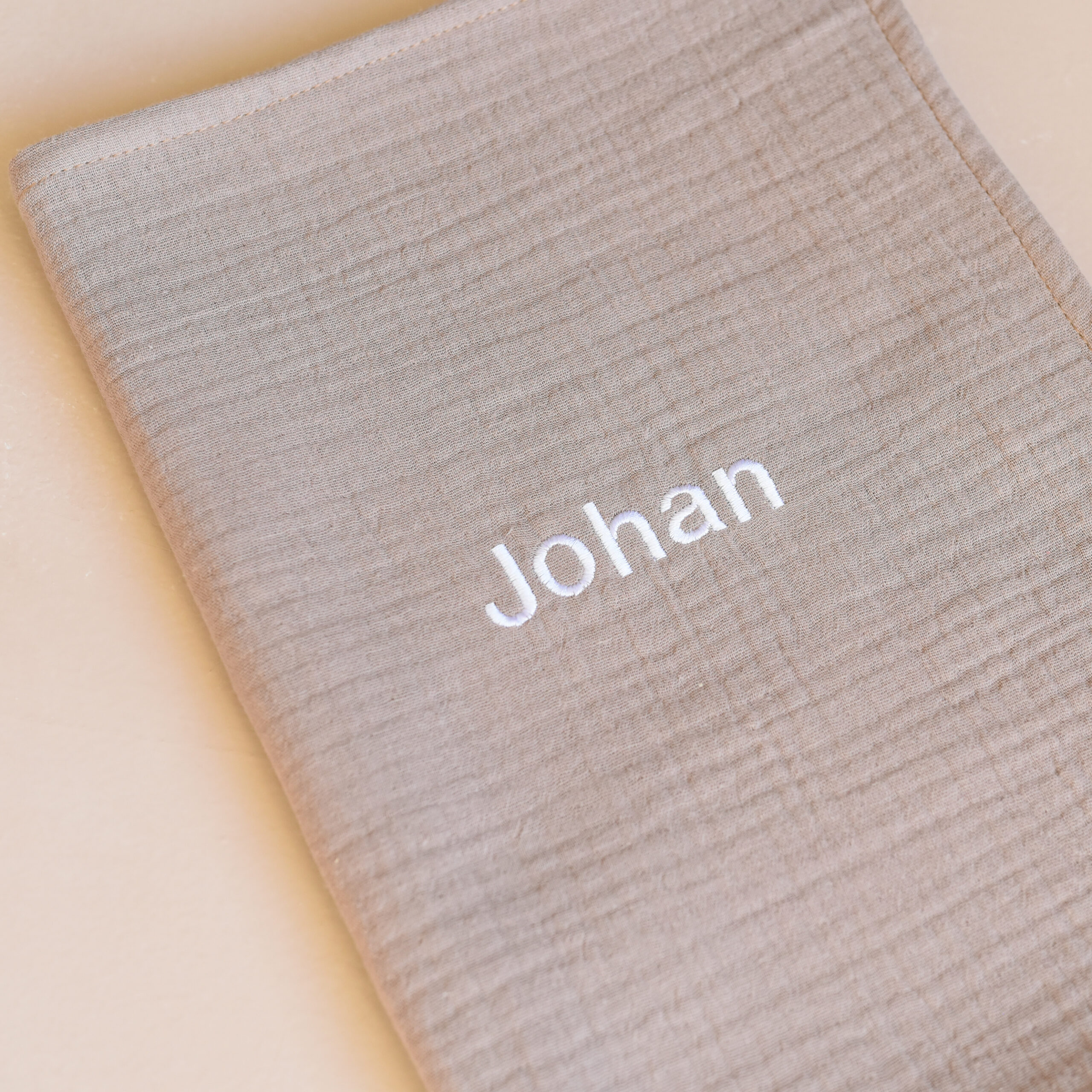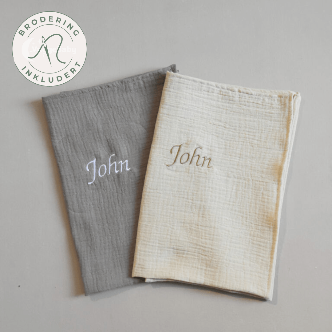 Koseklut gulpeklut med navn er laget av musselin bomull som føles behagelig mot huden. Kan brukes til alt- som sutteklut, koseklut, gulpeklut osv. Velg mellom to nydelige farger.