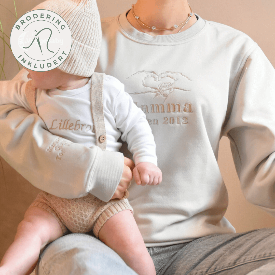 Mammagenser med personlig tekst. Denne genseren passer for mødre, bonusmammaer, og bestemødre – med mulighet for personlig tilpasning. Tilpass genseren med valgfri tekst, inkludert årstall for når hun ble mamma, samt barnas navn eller initialer brodert på høyre arm. En fin gave til en mamma full av omtanke. Mammagenser er en personlig og minnerik gave til deg selv eller en du kjenner. Kjøp gjerne pappagenser for matchende stil.