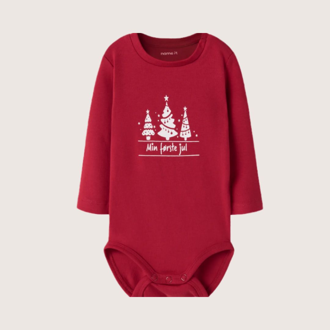 Feir julen i festlige og komfortable plagg som sprer glede og julestemning. Body for baby fra Nameit med nydelig juleprint. Perfekt til babyens aller første jul. Smekke i samme stil kan kjøpes separat.