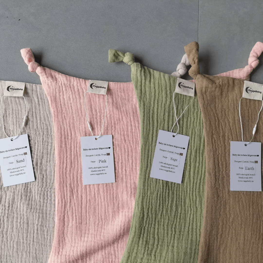 Det vi liker aller best med økologisk koseklut med knuter er hvordan vi har holdt oss til rene materialer uten plast eller syntetiske stoffer. Skulle kluten havne over ansiktet, kan babyen fortsatt puste lett gjennom stoffet. En liten detalj som gir stor trygghet. Og siden kosekluter er Øko-Tex sertifisert, vet vi at de er fri for skadelige kjemikalier, noe som føles riktig når vi sender dem ut til andre familier.