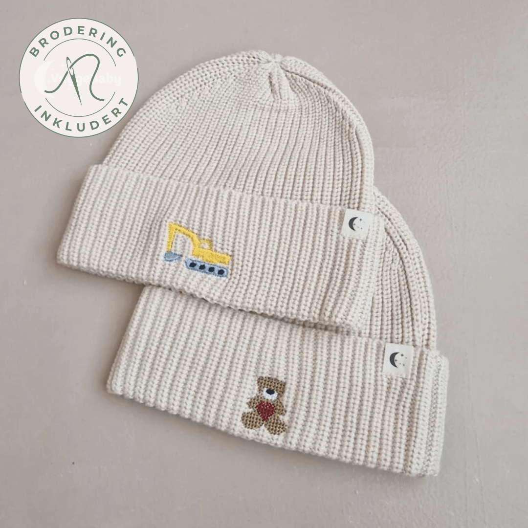 Myk økologisk strikkelue for baby og barn, laget av 100% bomull i sand farge. Broder motiv, perfekt som gave til dåp eller babyshower. CE-merket, bærekraftig og rask levering fra norsk lager!